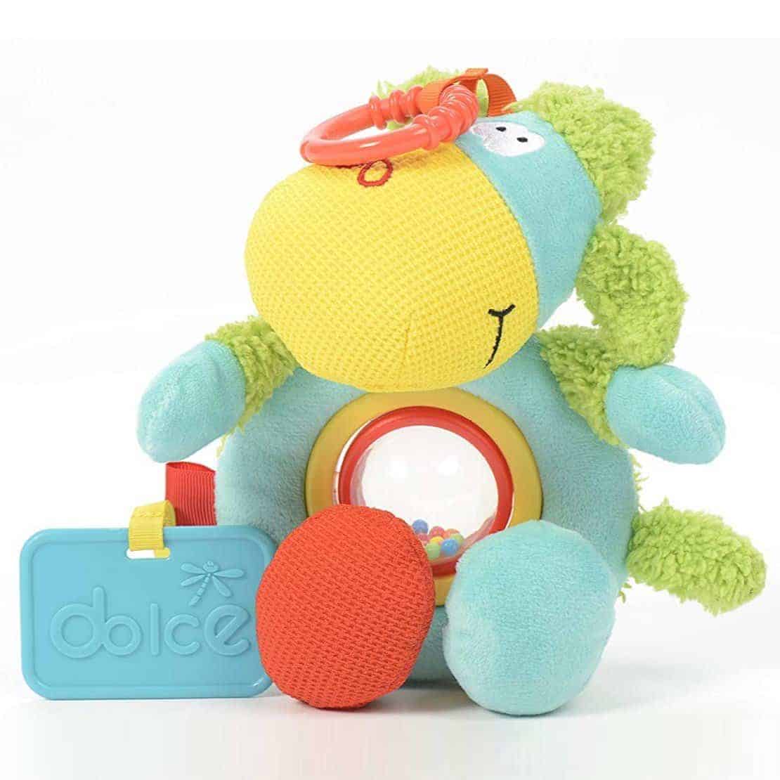Buntes Lern- und Kuscheltier mit vielen Details zum Entdecken, etwa Knitter-Ohren, einen Rassel-Bauch mit Perlen, eine Quietschenase, eine Beißplatte, und etliches mehr.