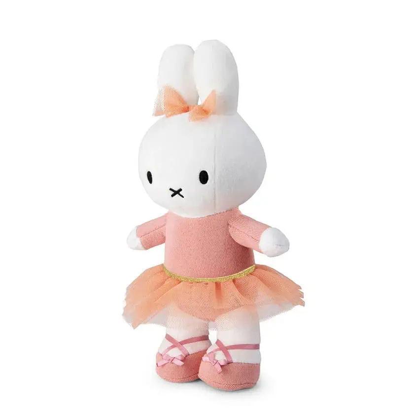 Miffy Ballerina liebt es, den ganzen Tag zu tanzen! Dieses 23 cm große, handgefertigte Kuscheltier besteht aus weichem Stoff und ist mit 100 % recyceltem PET gefüllt. Ideal zum Spielen und Kuscheln.
